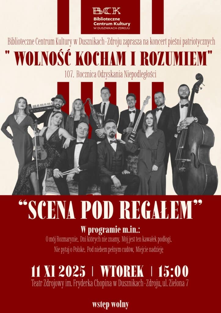 Część artystyczna rozpocznie się o godzinie 15:00 w Teatrze Zdrojowym im. Fryderyka Chopina. Publiczność będzie miała okazję wysłuchać koncertu pieśni patriotycznych w wykonaniu Sceny pod Regałem.